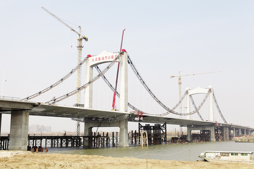 昨天上午,記者登上大慶路淮河公路橋主橋面時(shí),熱鬧的施工現(xiàn)場與寒冷的天氣形成了鮮明的對(duì)比。大橋最南端的接線上,幾臺(tái)機(jī)器正在攤鋪?zhàn)詈笠粚訛r青。大慶路淮河公路橋建設(shè)指揮部技術(shù)質(zhì)量部部長薛峰告訴記者,橋面瀝青一天之內(nèi)就能鋪好。“瀝青是最后一道主要工序,完成后就標(biāo)志大橋主體大功告成了。”
